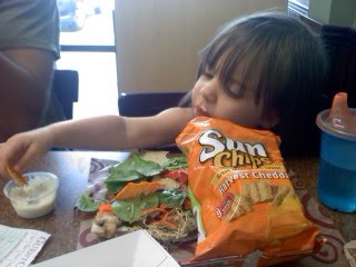 We took Daddy to Roly Poly when he got home from being offshore so he could try the frozen yogurt as well, where Leena immediately picked out the SAME chips as last time.